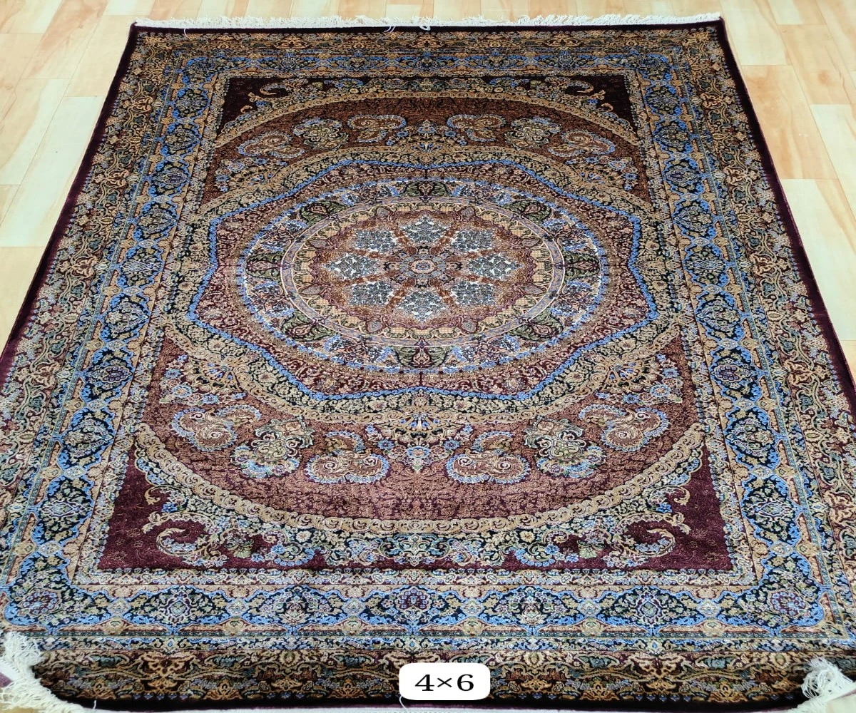 Design Motifs: Central medallion, surrounding floral arabesques, and symmetrical border work.
