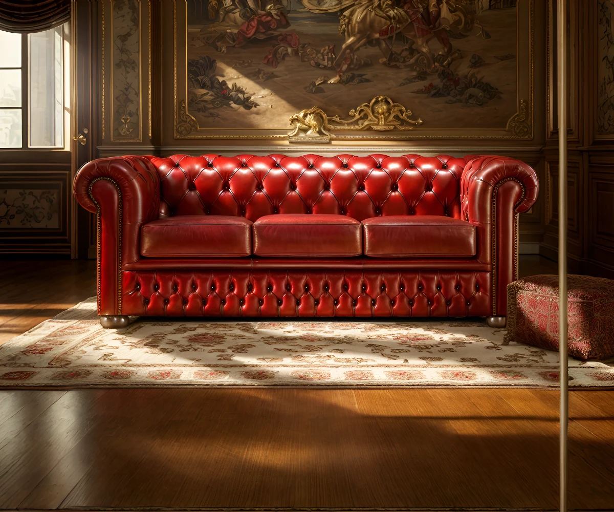 The sofa boasts a rich, natural texture that softens with age, developing a distinguished patina unique to your home. The deep, diamond-button tufting across the backrest and rolled arms exudes old-world charm, while the refined silhouette brings timeless style to any interior — from stately libraries and formal living rooms to contemporary lofts with a classic twist.